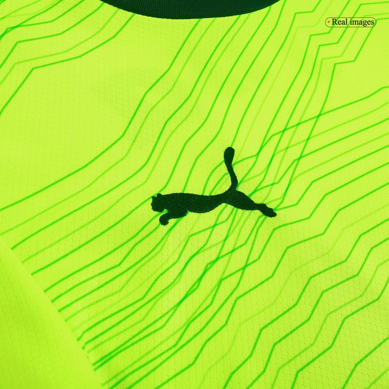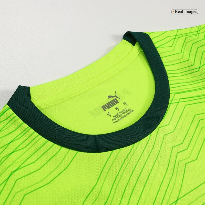 The collar and cuffs of the Puma Palmeiras 23-24 third football shirt are in flag green, which complements the lime green sleeves perfectly.