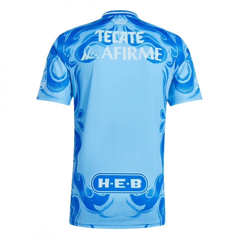 The Adidas Tigres 25-26 away football shirt is predominantly blue with a large tiger face pattern in the center of the shirt in a lighter shade of blue.