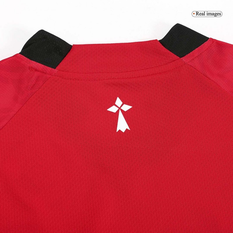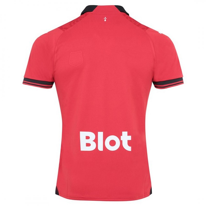 Staying true to the club's traditional color scheme, the Puma Stade Rennais F.C. 2023-24 home shirt is predominantly red with white logos and black on the collar and sleeve cuffs.