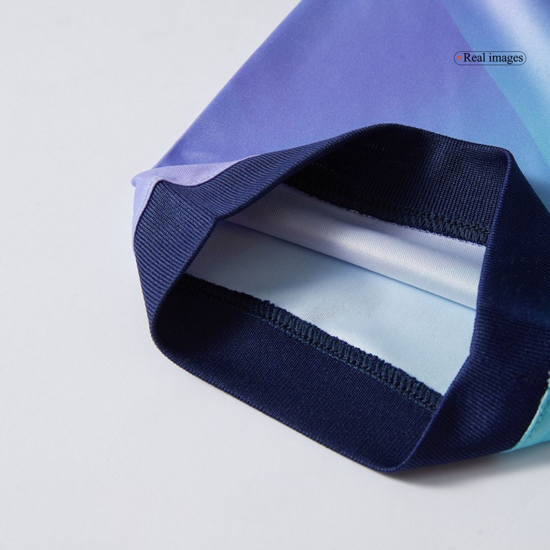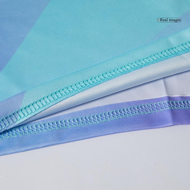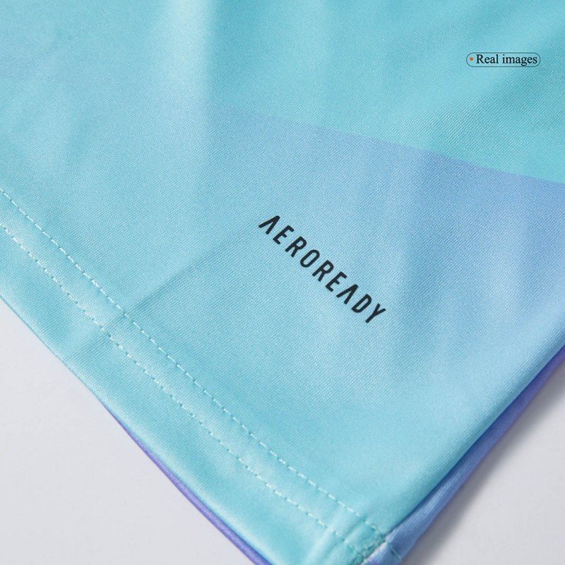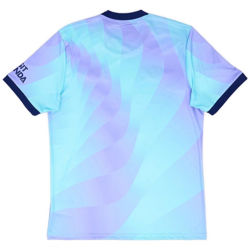 The Arsenal 24-25 third football shirt has an aqua main color combined with Light Purple and Navy Blue.