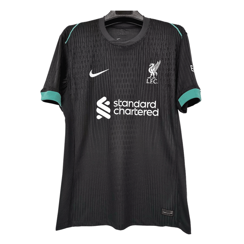 The Liverpool 2024-2025 away jersey combines a dark anthracite base (almost black) with light turquoise and lighter anthracite applications.