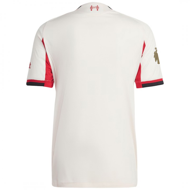The Adidas Liverpool 2025-2026 away jersey features a clean and modern design, combining a light Wonder White base with bold Red and Black accents.