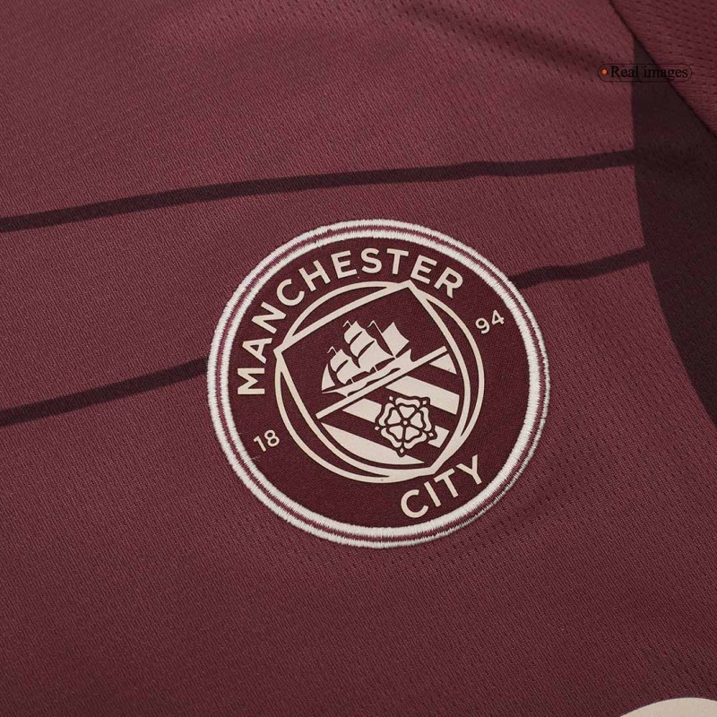 The Manchester City Football Club 24-25 third jersey is maroon - the first time with Puma and for the first time since the 2017-18 away kit.