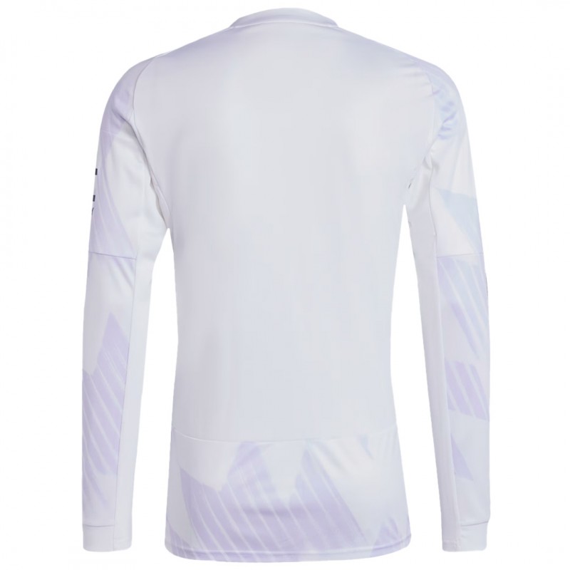 The Adidas Manchester United FC 2025-2026 away shirt is white and light lavender, combined with dark purple accents (Dark Plum).