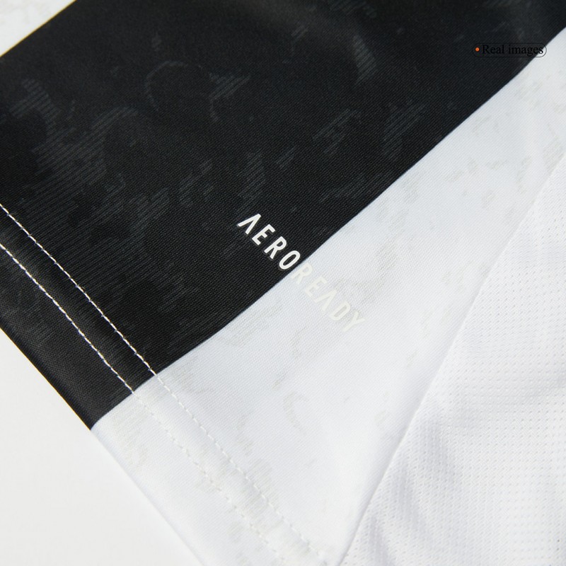 The new Juventus 2024-25 home football jersey is a traditional white and black with two large black vertical stripes running across the Brand logo and Juventus crest.