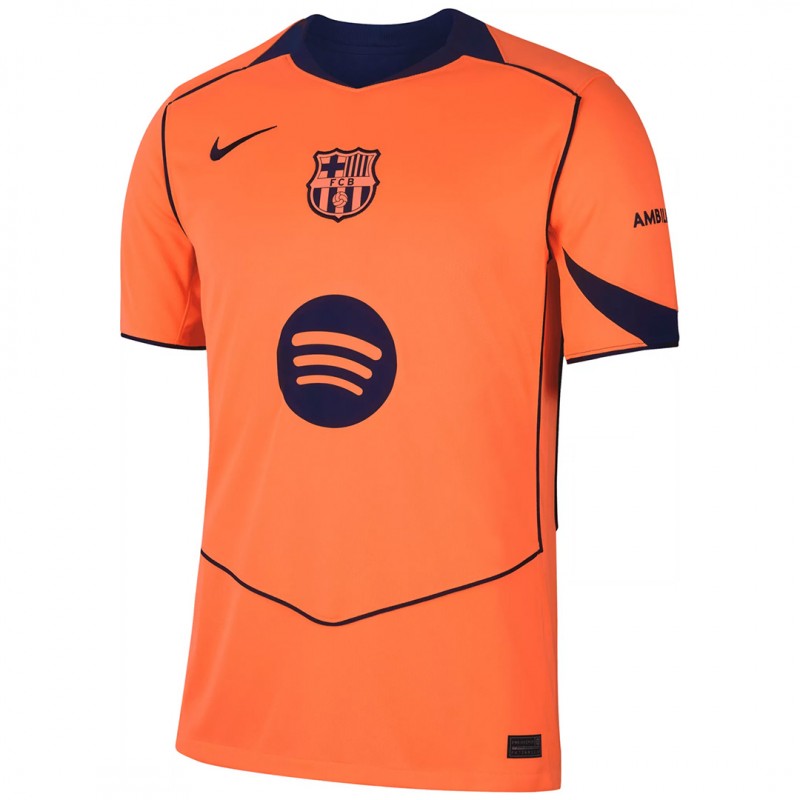 The Nike Barcelona 25-26 third shirt is predominantly bright orange (officially "Bright Mango"), combined with a dark navy ("Midnight Navy").