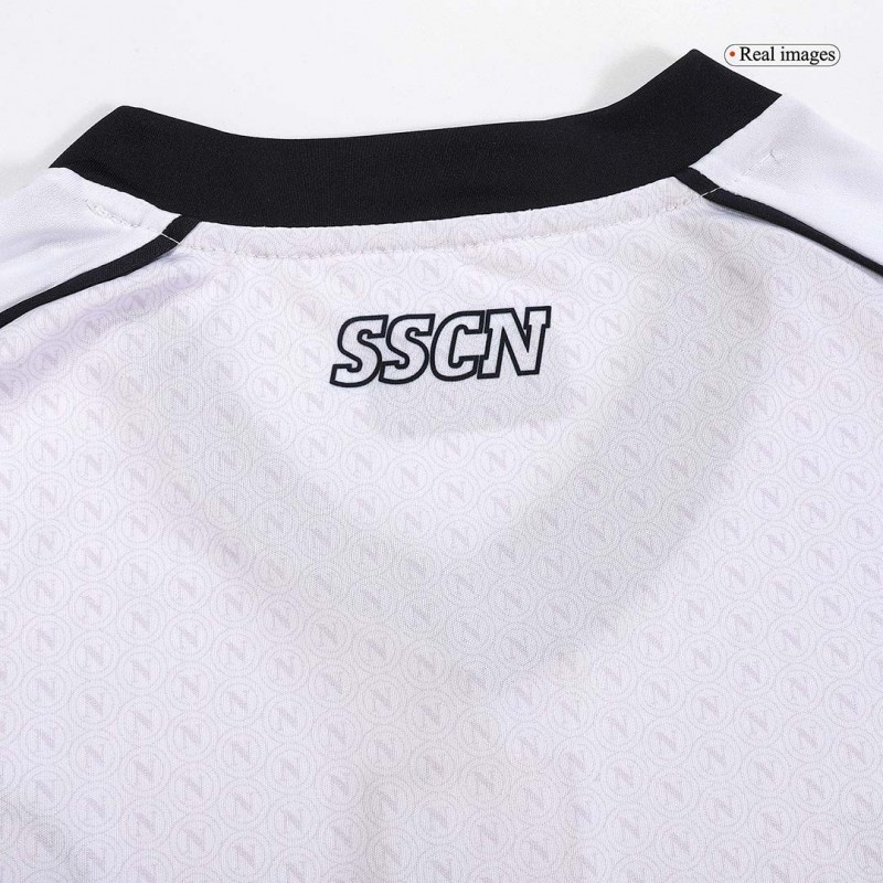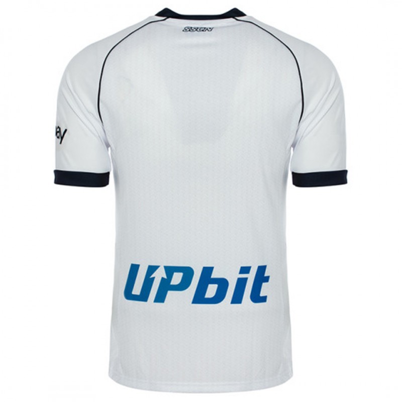 The EA7 Napoli 2023-24 away jersey is white combined with dark blue for all logos and trim.