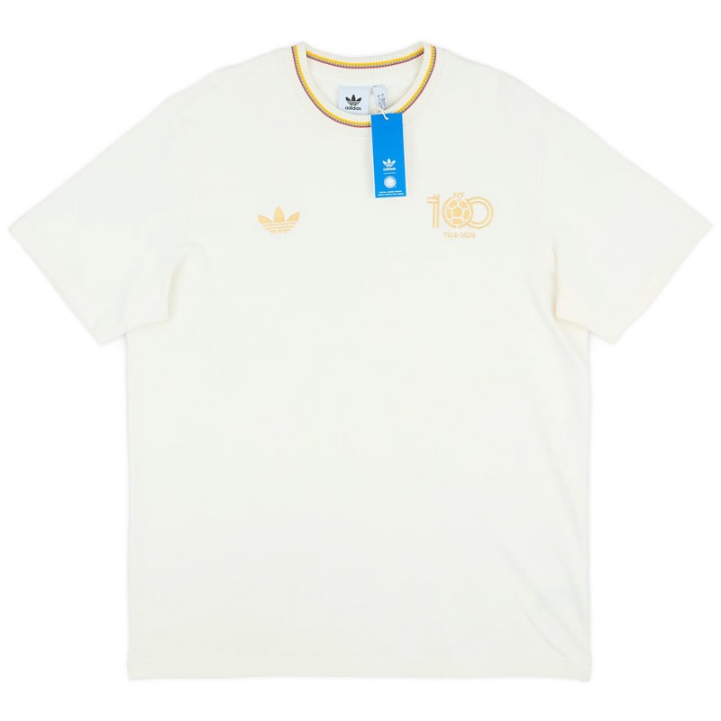 The Colombia 2024 100-year anniversary football shirt features the Trefoil logo, and the Colombia football crest is the same color as the shirt, making it invisible from a distance.