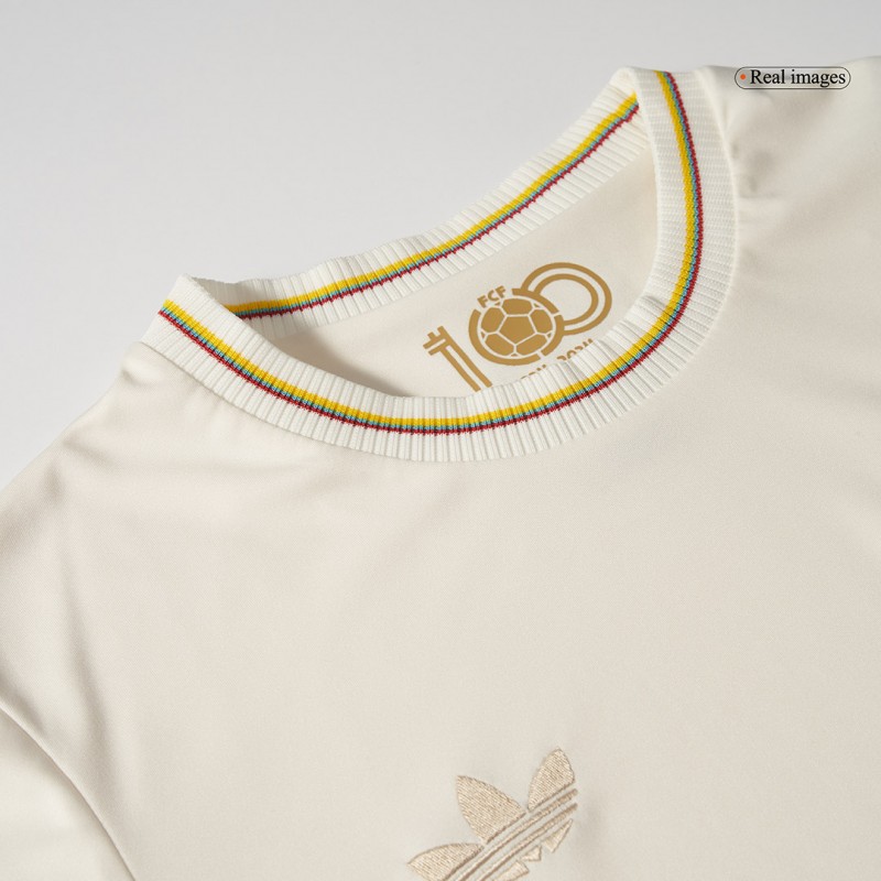 The inside collar of the shirt features the number 100, accompanied by the Colombia football crest and the letters FCF, to celebrate the 100th anniversary of Colombian football.