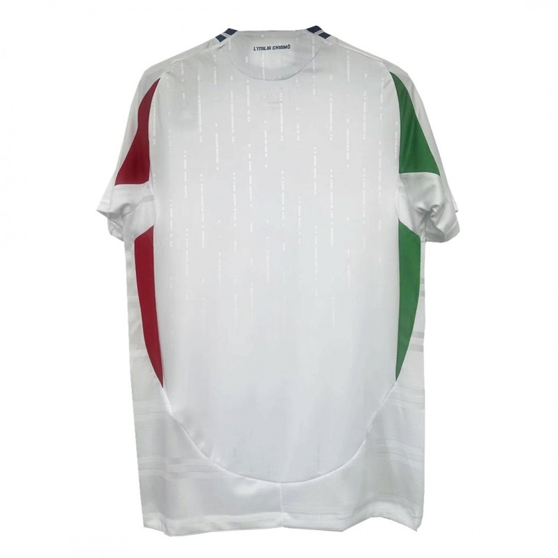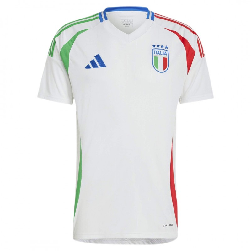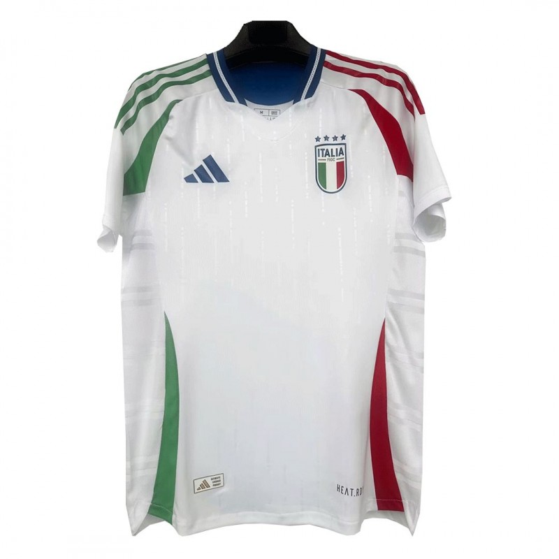 The Adidas Italy 2024 away jersey combines a white base with blue logos.