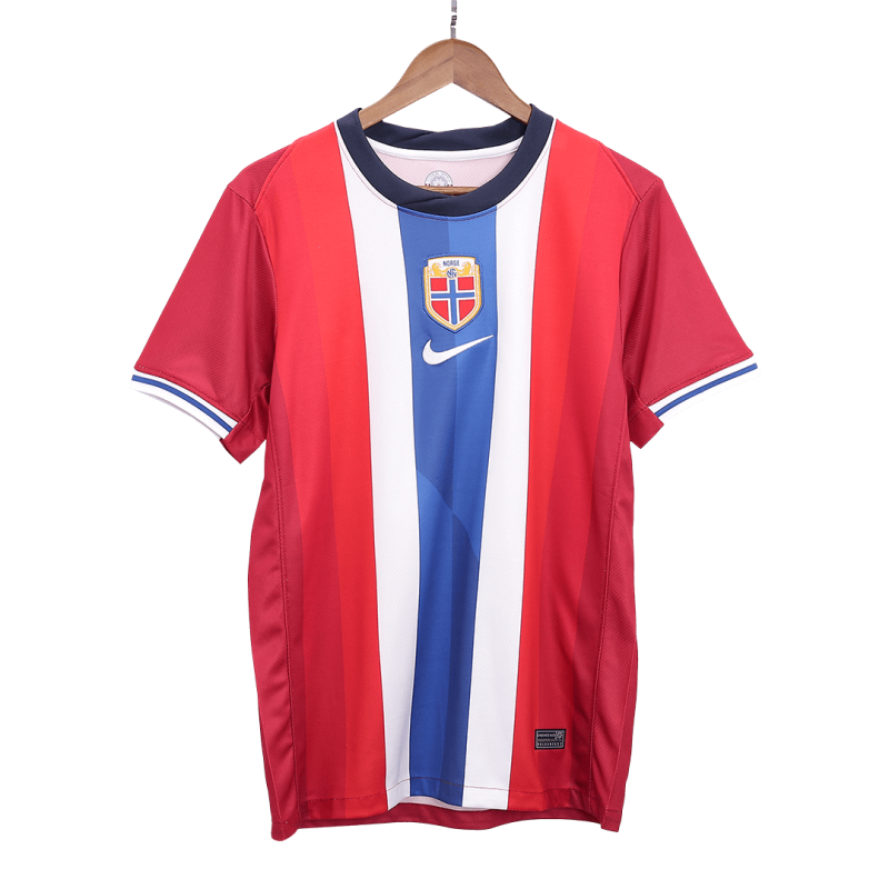 The new Nike Norway 2024 home shirt features a unique design with vertical blue/white/red stripes arranged symmetrically for an impressive look.