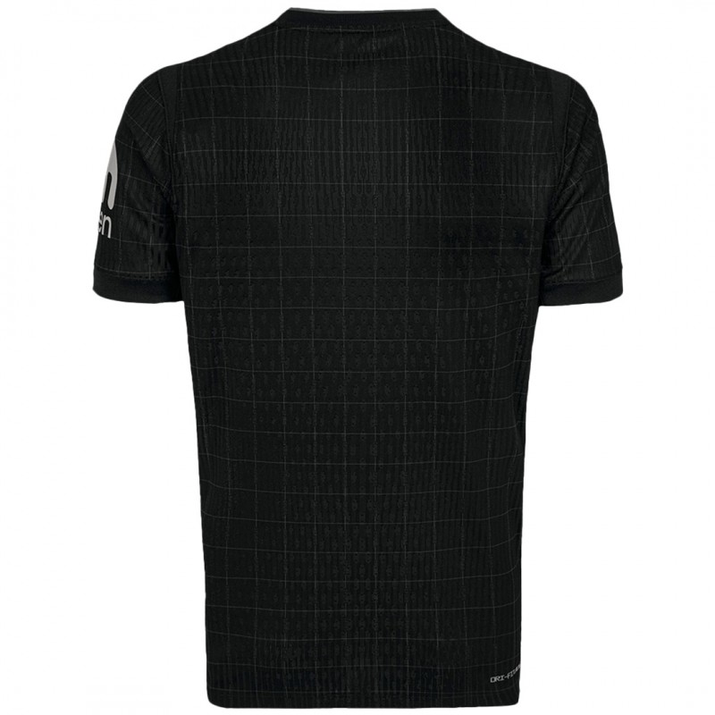 The Nike Tottenham 2025-26 away football shirt is predominantly black with grey accents (Lt Iron Ore) and white logos.