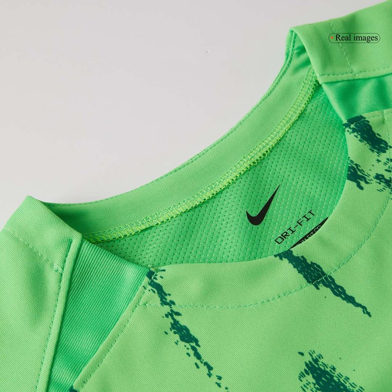 The Sporting CP 24-25 third football shirt is predominantly bright green with darker green V-shaped motifs creating an extremely striking look.
