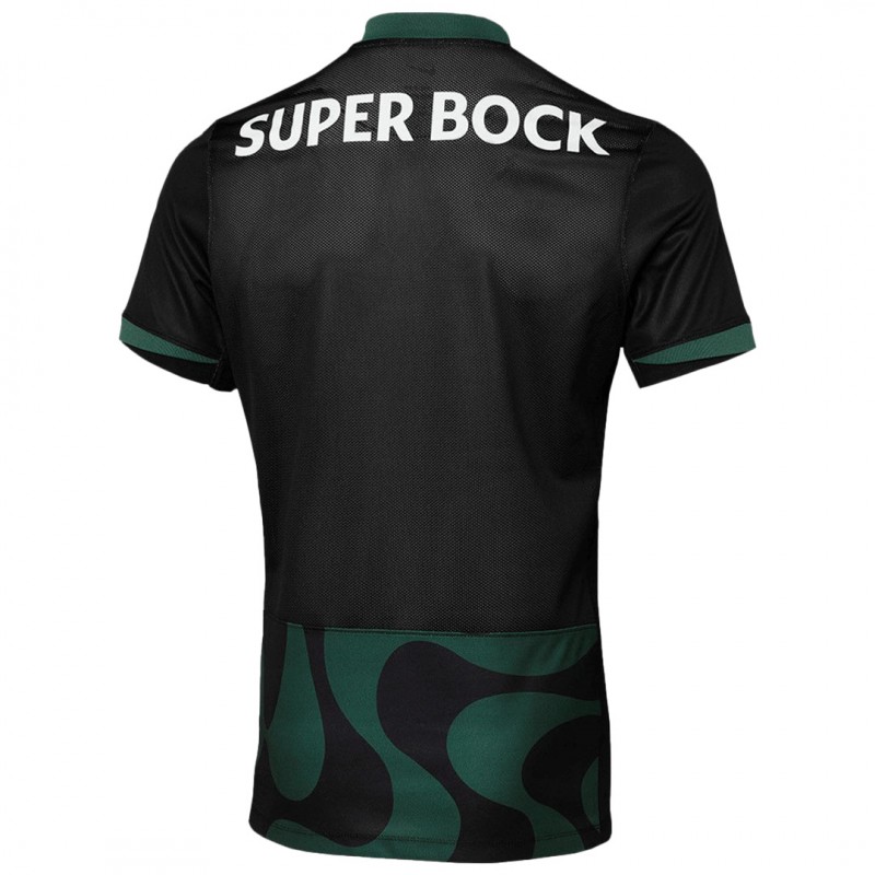 The second Nike Sporting 2025-26 away football shirt flips the color palette with a black base and green for the swirls.