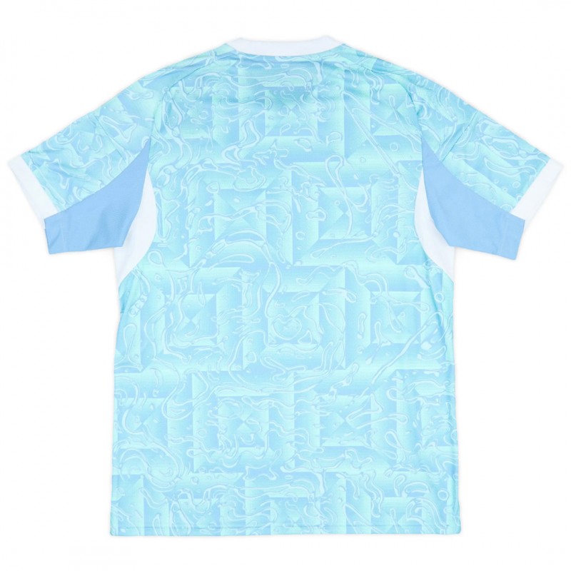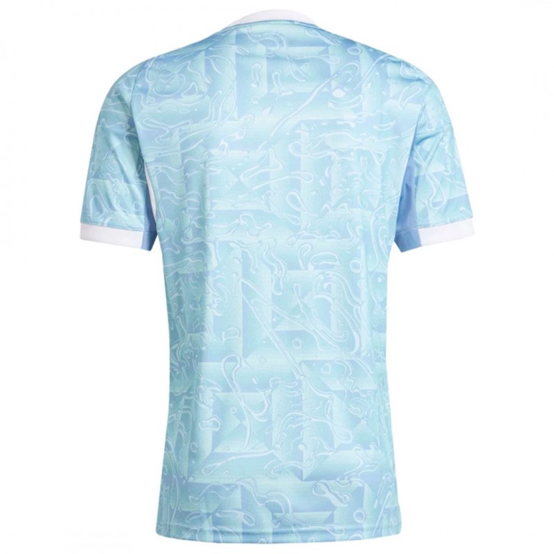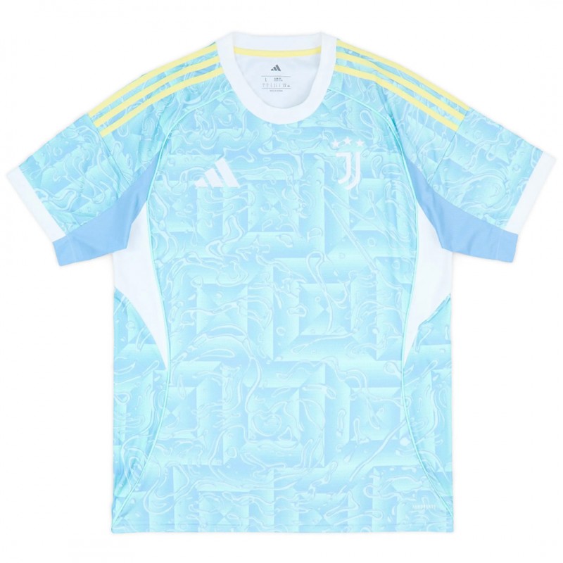 The Adidas Juve 2025-2026 away football shirt is predominantly light blue, with white logos and light citrus yellow details.