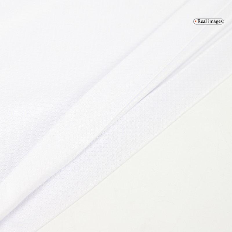 The PSG 2024-2026 away shirt is white, blue, and red. What makes the kit outstanding is the design.