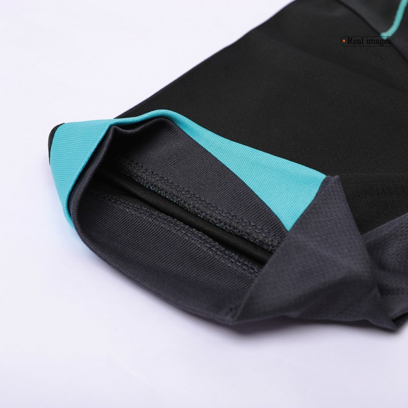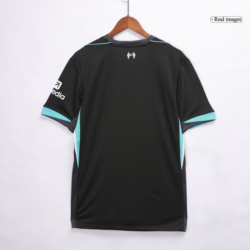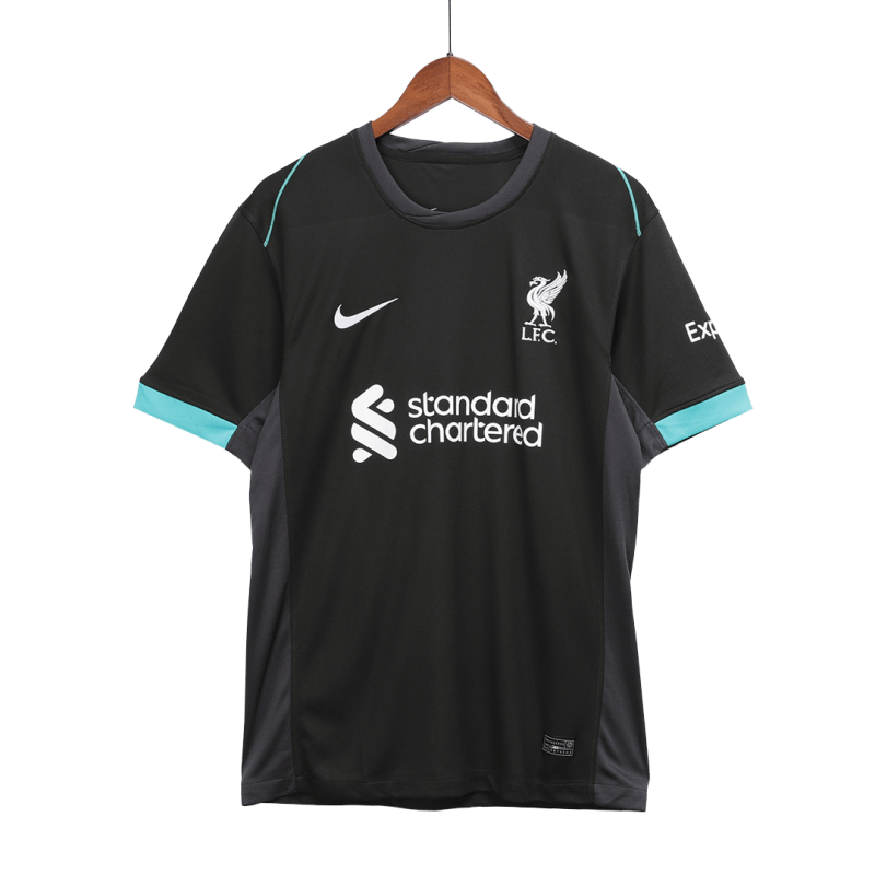 The Liverpool 2024-2025 away jersey combines a dark anthracite base (almost black) with light turquoise and lighter anthracite applications.